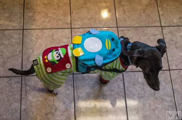 ▼狗狗背著企鵝包。