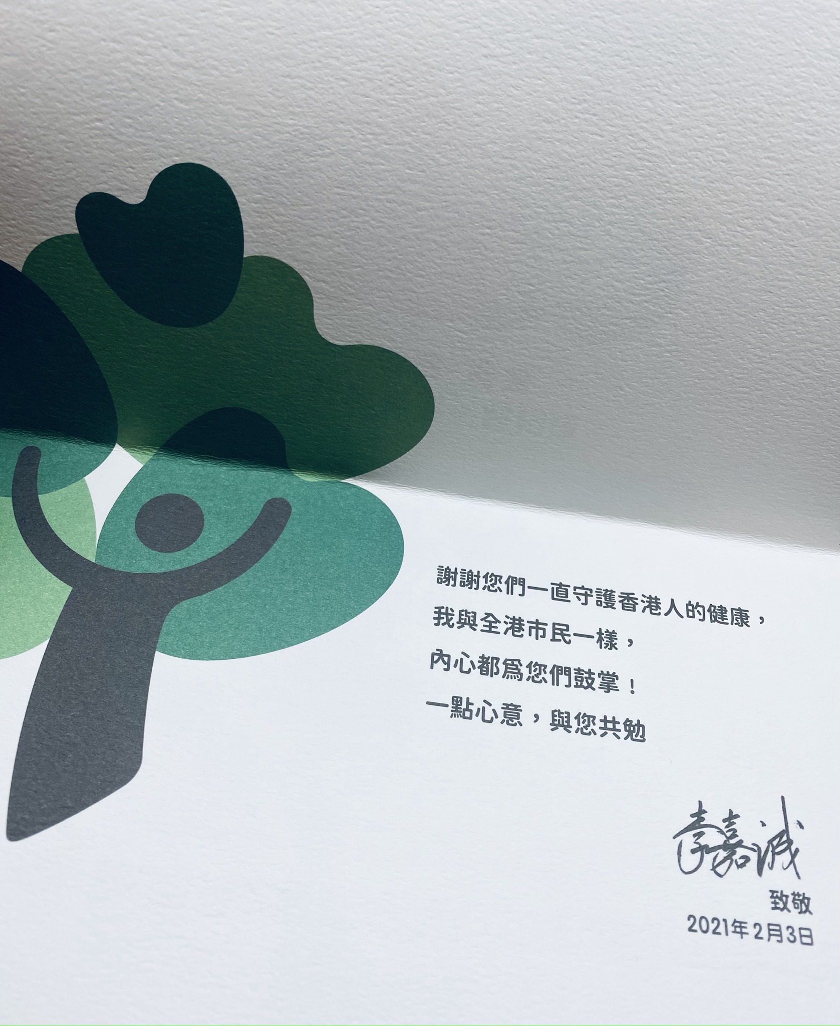 ▼這份小卡被稱作是「春天的禮物」,封面上寫著「醫護香港一脈相連」、「感恩感激」等字眼,運送到各大公立醫院發送給醫管局全體醫護人員。卡片中則寫道「謝謝您們一直守護香港人的健康,我與全港市民一樣,內心都為您們鼓掌!一點心意,與您共勉。李嘉誠致敬。」讓人十分感動。