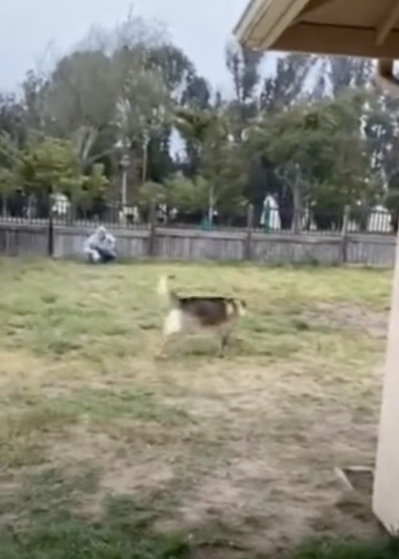 ▼David想給毛孩子一個驚喜,所以沒有直接進屋。馬麻開門讓Rocky去後院時,David已經等在那裡,他背對著毛孩子,想看看Rocky會有什麼反應。他已經離開5個月,這對於毛孩子來說是很長的時間,Rocky還記得他嗎?