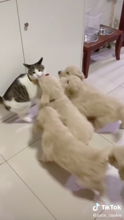 2021年02月09日狗狗友善熱情,哪怕面對其他動物,也會主動跑去親近~日前TikTok帳號@joice_cooki分享了一段有趣的影片,只見一群可愛的阿金寶寶看到貓咪後,竟然衝過去將貓咪團團圍起。貓咪被小奶狗們圍繞住、無處可逃,那無奈的模樣非常好笑。
