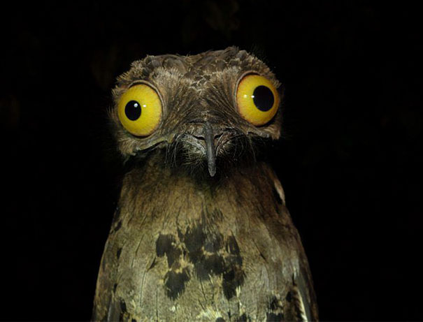 ▼貓頭鷹表演特技「鬥雞眼」。