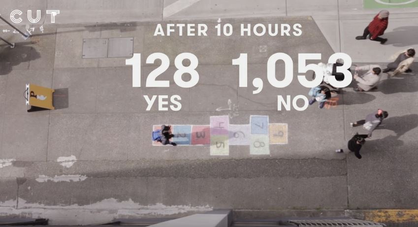 ▼這個實驗耗時10個小時,共有1,053位路人從這段路經過,其中128人開心玩跳房子遊戲。