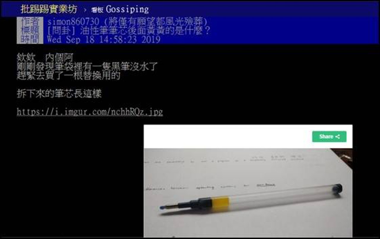 ▼原po表示,他的筆袋裡有一隻黑筆沒水了,於是他去買了一根替換用的新筆芯。他將用完的筆芯拆下來,發現黑色的墨水已經見底,但後面有一段黃色液體。他對這些液體很好奇,希望了解原子筆結構的網友能幫忙解惑:「它到底怎麼推著墨水前進的?」