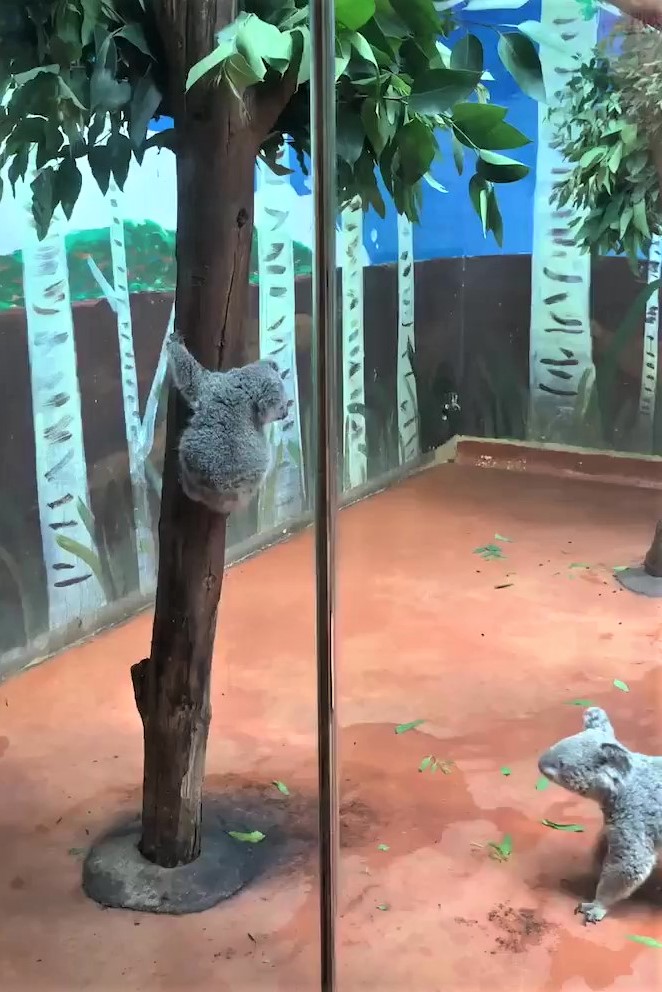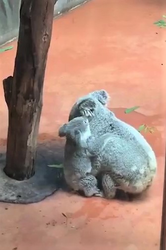 ▼攀在樹上的無尾熊寶寶不敢下樹,牠頻頻往下看,動作遲疑、非常緩慢。旁邊的無尾熊媽媽注意到小孩的緊張,連忙過去幫忙。牠一手扶著樹,另一隻手溫柔扶著小孩的PP。