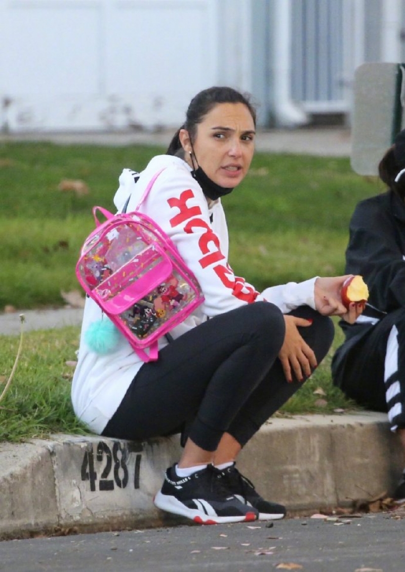 ▼蓋兒加朵穿著白色的上衣、緊身運動褲。跟很多媽媽一樣,女兒開心玩耍的時候,她負責揹著女兒充滿童趣的小書包。她隨意坐在路邊,一邊吃蘋果一邊跟友人閒聊,這場景非常真實,相信不少媽媽都有過同樣的經歷。