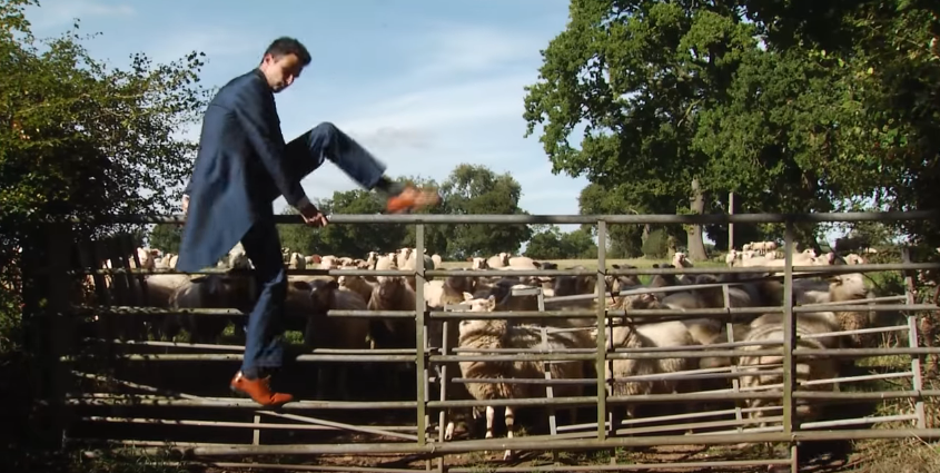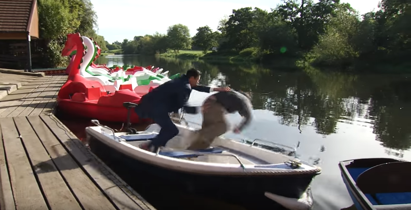 ▼新郎衝出教堂後,舞台上突然落下布幕,上面竟然開始播放新郎一路上遇到的各種小狀況。他為了快點回家拿到戒指,穿過羊群、坐上搖搖晃晃的小船、借小女孩的兒童腳踏車等等,克服重重關卡才回家拿到戒指。