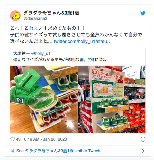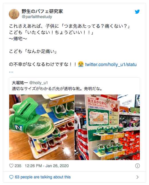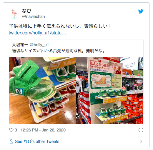 適切なサイズがわかる爪先が透明な靴。発明だな。 pic.twitter.com/nicB5gvAlt