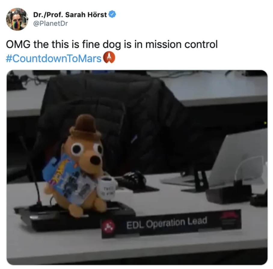 ▼毅力號順利登陸火星令人驚喜,但網友們卻在影片中發現了新亮點-一位科學家的桌子上竟然擺著一隻可愛的「This Is Fine」狗狗玩偶。