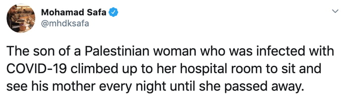 2021年06月01日新冠肺炎在全球大流行,無數家庭因此面臨天人永隔的狀況。去年在巴勒斯坦希伯侖有一位73歲的老婦人,她確診新冠後不得不住院治療。由於必須隔離治療,期間家人不能夠探望、避免傳播的可能,於是她的小兒子Jihad Al-Suwaiti就每晚爬牆來到她的病房窗口,坐在窗外陪伴母親。