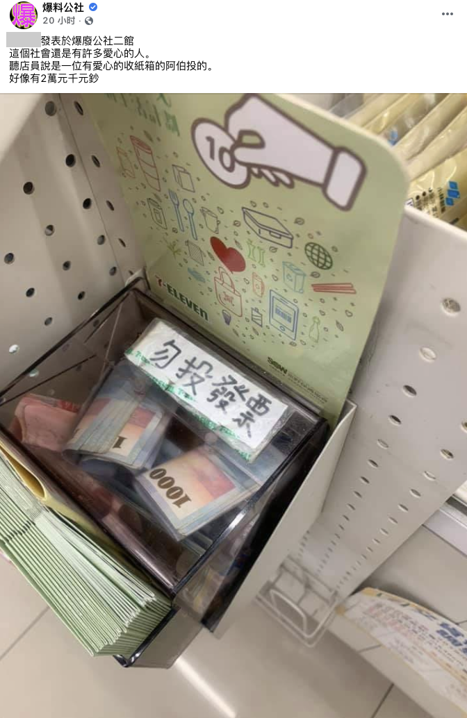 ▼原Po表示,他那天到超商櫃檯結帳,發現旁邊的捐款箱裡塞了滿滿的千元鈔,目測金額至少破萬。他非常好奇,詢問店員金額有多少,店員回答:「好像有共2萬元千元鈔。」不僅如此,店員還透露,這名善心人士是一位收紙箱的阿伯。這讓原Po非常佩服,感動說:「這個社會還是有許多愛心的人。」