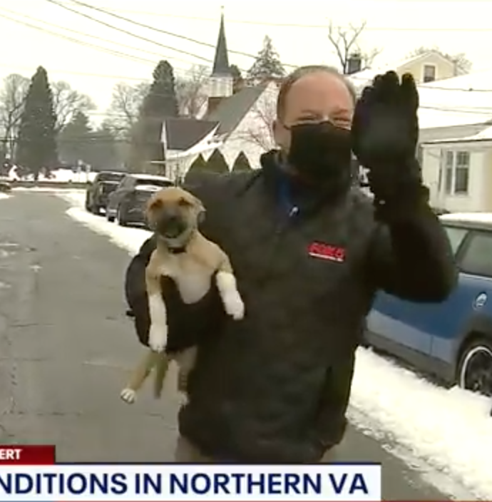 2021年02月28日記者在現場連線報導時經常會遇到一些突發情況。不久前華盛頓Fox 5台的記者Bob Barnard在利斯堡(Leesburg)街頭報導天氣情況時,就遇到了一隻自來熟的小狗。這隻狗狗跑過來撒嬌賣萌求抱抱,讓原本無聊的天氣報導畫面變得非常有趣~