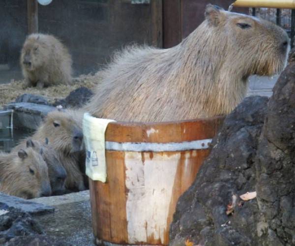 水豚也迎來溫泉祭 網抓包旁邊那隻「硬塞木桶」大笑:會擠到變形啦!
