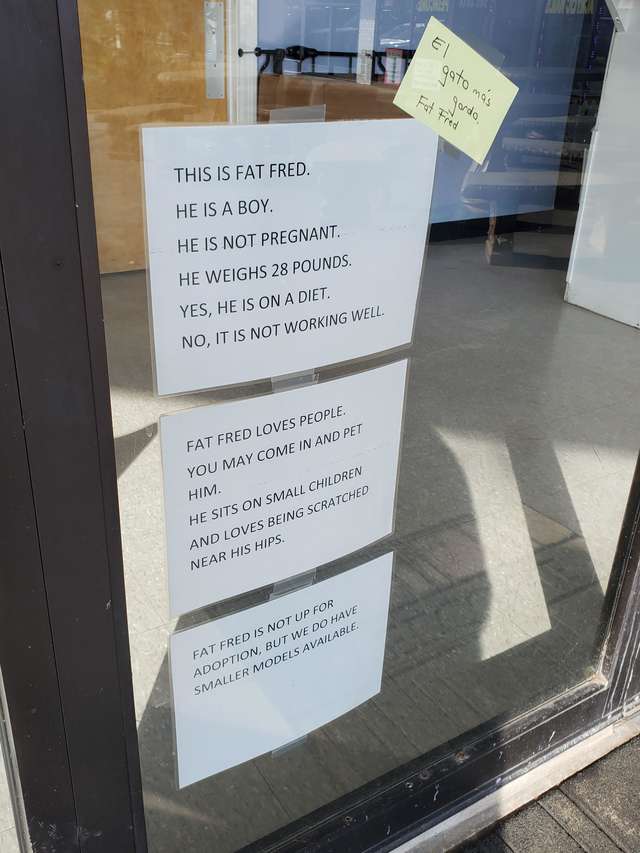 ▼Marcia實在不願意一遍遍解釋Fat Fred的體型問題,於是在門上貼了一張公告:「牠叫Fat Fred,是個男孩子,不會懷孕。牠的體重是12.5公斤,已經在減肥了,但瘦不下來。Fat Fred很喜歡人類,歡迎來跟牠玩,牠可以坐在小朋友腿上、喜歡別人摸牠的屁股。Fat Fred不是待領養的貓咪,但我們這裡確實有一些小貓正在等待領養。」