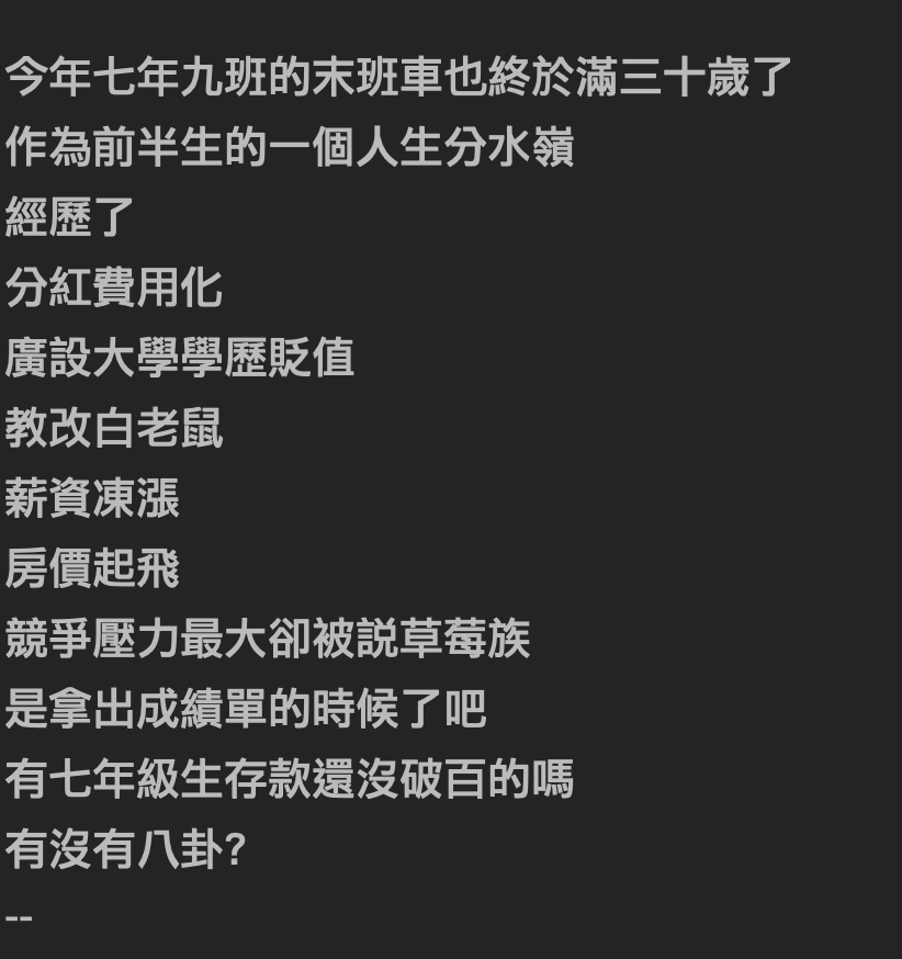 ▼原po發文說,今年7年9班(79年次)的末班車已滿30歲,來到了前半生的人生分水嶺。經歷了分紅費用化、廣設大學學歷貶值、教改白老鼠、薪資凍漲、房價起飛、競爭壓力最大卻被說「草莓族」的7年級生,是時候該拿出成績單了。最後他發出靈魂質問:「有7年級生存款還沒破百萬的嗎?」