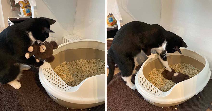 ▼推主看到Marumo的舉動覺得非常驚奇,Marumo就像小朋友在玩扮家家酒一樣。牠不僅教小熊玩偶上廁所,還會把其他玩偶叼到貓砂盆裡去,好像要教會所有的玩偶上廁所。推主笑說:「要是像小熊一樣的顏色,沒仔細看還真會誤以為是Marumo的便便XD」