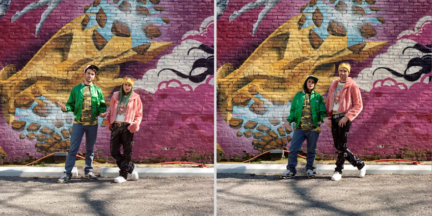 ▼剛開始男生穿著帥氣的背心和黑色褲子,女生則穿著豹紋短褲和襯衫。兩人互換衣服後,氣質都出現了很大的改變。他們故意擺出對方拍第一張照片時的pose,看起來非常逗趣。