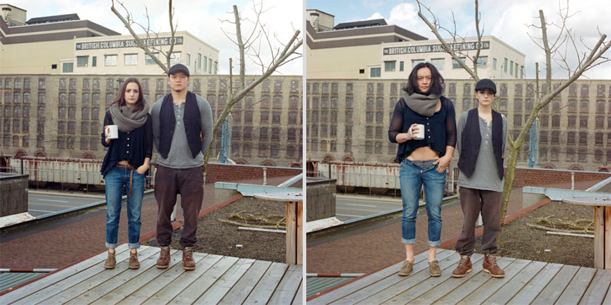 2021年03月02日最近社交影音平台上興起一股「情侶換裝」風潮。跟穿情侶裝放閃相比,情侶之間互換衣服拍照留念顯得更有趣味。其實早在2010年時,加拿大攝影師Hana Pesut就拍過相關主題的照片。當時他和一對情侶朋友去露營,突然想到換衣服來穿應該很好玩,於是拍下了第一組男女換裝照。