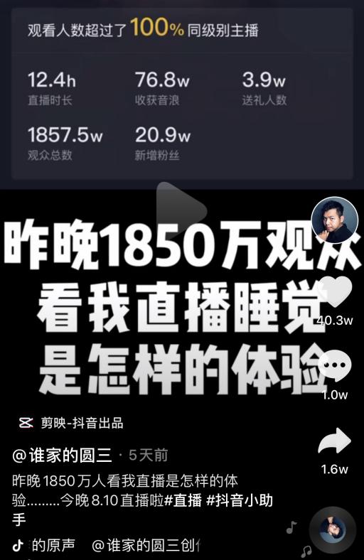 「誰家的圓三」說,他不想成為只會睡覺的直播主,更想通過有趣的影片和創意來留住粉絲。不過他的成功也給不少直播主啟發,很多人模仿他開直播睡覺,成績竟然也很不錯。疫情導致大家減少出門,這種「睡覺就能賺錢」的商機竟然也出現了,真的讓人覺得很驚奇啊~