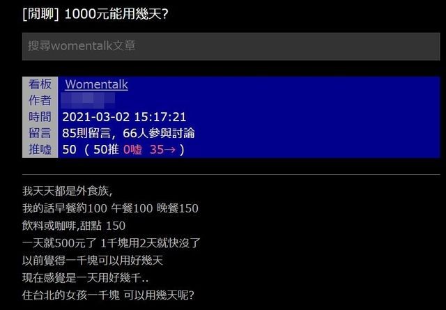 這則帖文很快引發討論,網友們紛紛留言說:「以前一餐只能接受4、50,1000是大錢可以花很久,最近一、兩年,1000咻一下就花完」、「大概2天,點心通常月初一次去大賣場買齊自己帶,飲料自己泡茶」、「通常一天或半天就沒囉」、「跟你一樣,你還少算了偶爾的聚餐,當天如果有朋友聚會,一天直接噴掉1千」。