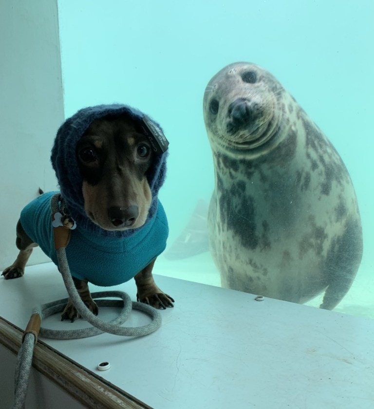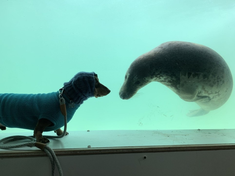 認錯了啦!呆萌海豹見「戴帽子臘腸犬」以為是同類 隔玻璃搭訕:你怎麼不用在水裡?