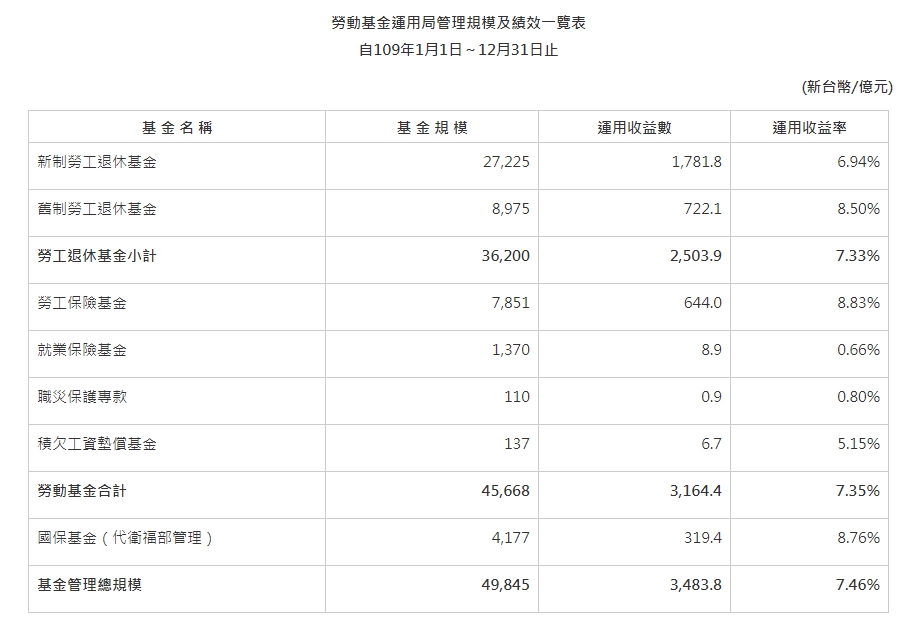 2021年03月08日勞動局勞保局表示,109年度新制勞退基金收益總計新台幣1781億7726萬餘元,收益率為6.94%。參與收益分配的退休金個人帳戶共有1205萬戶,其中有60萬戶可以領到5萬以上的紅利。