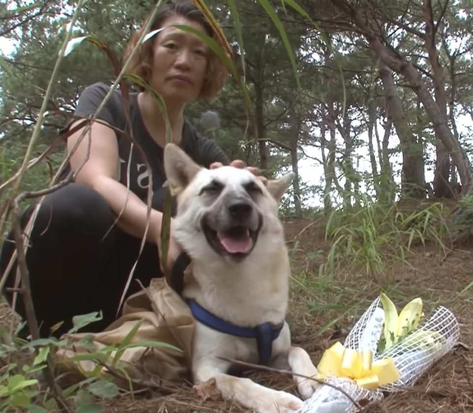 ▼金東每天都翻牆跑出去,主人擔心牠的安全,就在牠身上裝攝影機,想看看牠要去哪裡。只見牠一路跑到山上,然後就待在那裡不動了。主人一看就明白,那是牠的好友「恩東」埋葬的地方。