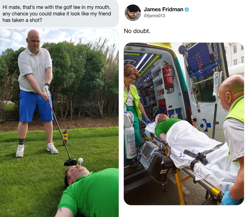 ▼「這是我和朋友拍的搞笑照片,能不能讓我看起來像揮桿成功?」