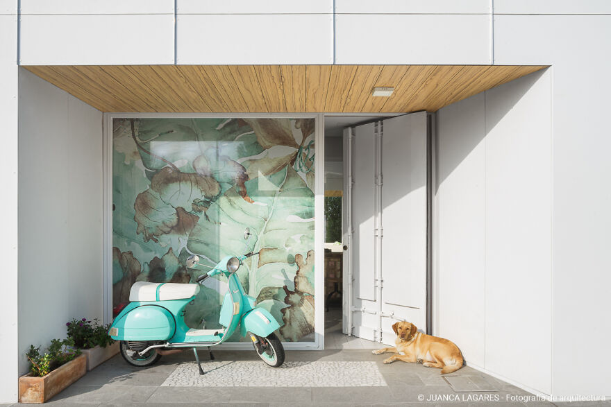 ▼貨櫃屋陳舊的外觀用白色和原木色覆蓋,讓整個建築呈現出明亮又簡潔的質感。