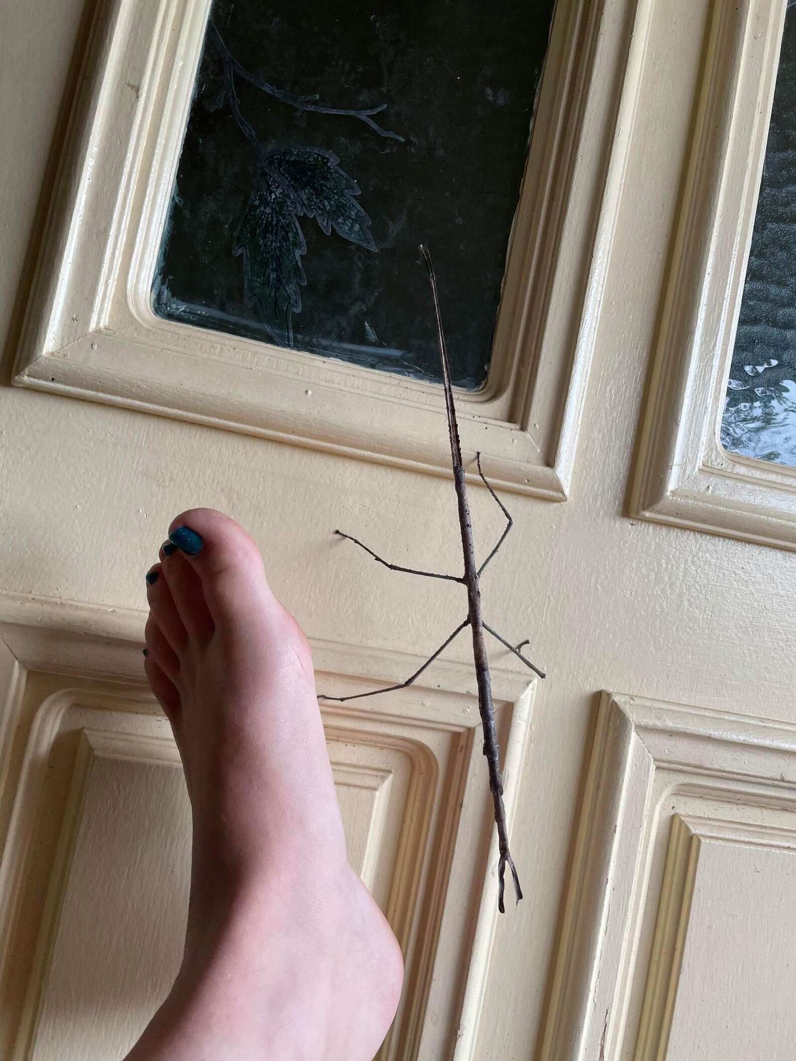 ▼最近Danni家又出現了全新的生物。那天她開門取包裹時,發現門上黏著一根奇怪的「樹枝」。這根「樹枝」又細又長,還長著腳。Danni抬腳對比了一下,發現「樹枝」比她的腳還要長!