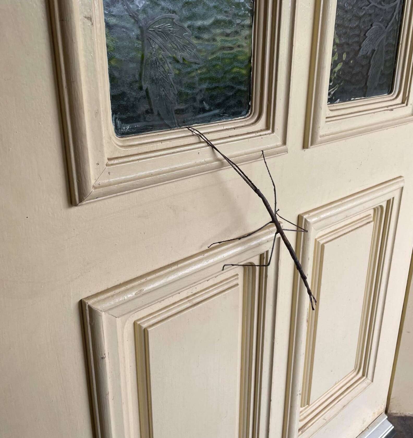 ▼原來這是一隻竹節蟲!Danni說:「我嚇了一跳,以前我也見過竹節蟲,但都沒有這麼大,也絕對沒有在我家門口看到過。」Danni猜這隻竹節蟲可能迷路了,不小心跑到她家門口,也不知道怎樣回家。她說:「牠在我家前門上待了12個小時。為了牠的安全,我必須把牠轉移到其他地方,因為我家小孩很喜歡撿樹枝。」
