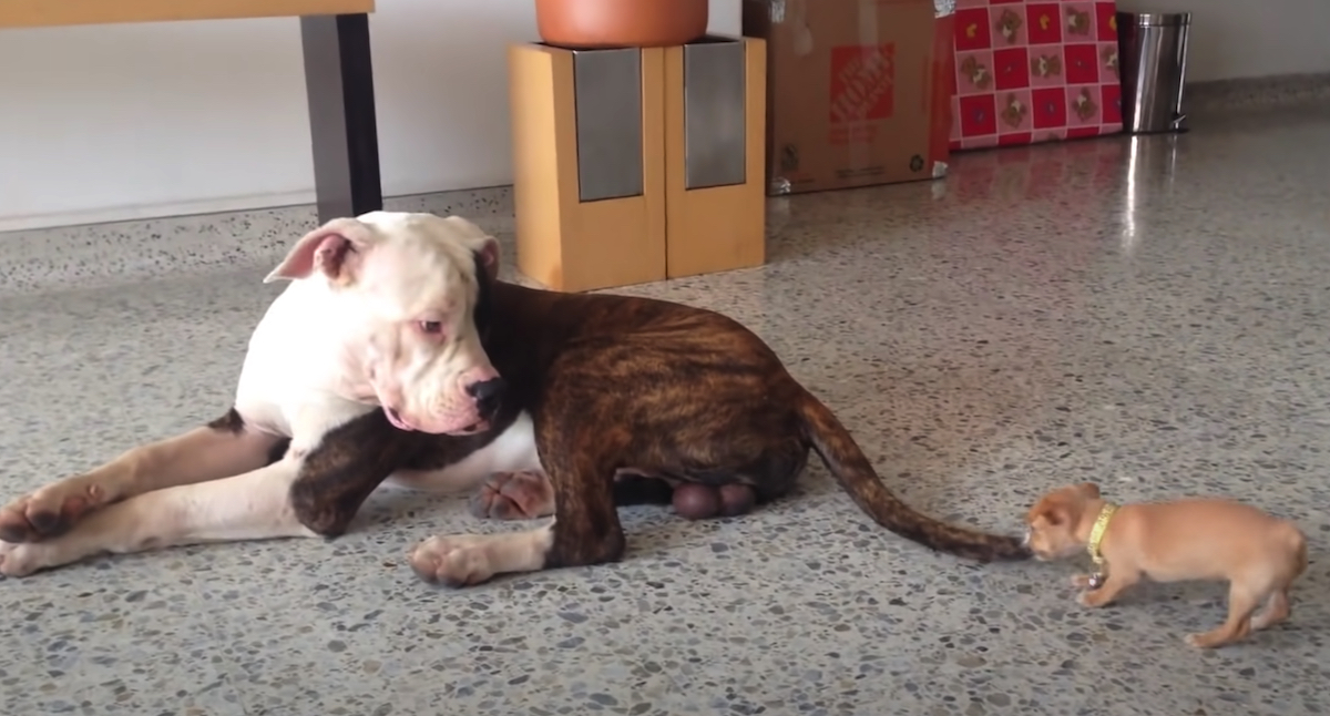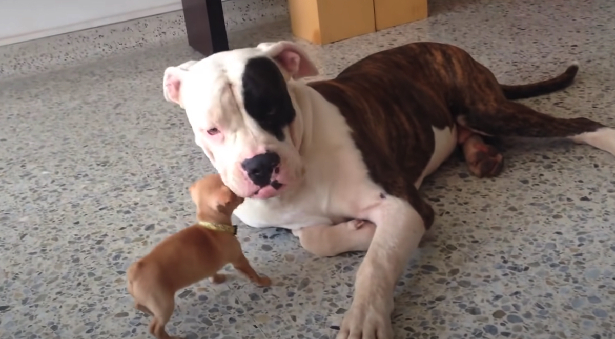 ▼狗狗玩耍時會互相追逐、啃咬對方的耳朵,還會將對方壓在地上。主人有時會擔心,這到底是在遊戲,還是攻擊?影片中的這對鬥牛犬和小狗的組合就不會有這樣的問題,因為這隻鬥牛犬很溫和,不會因為小狗太調皮,不耐煩就打起來。