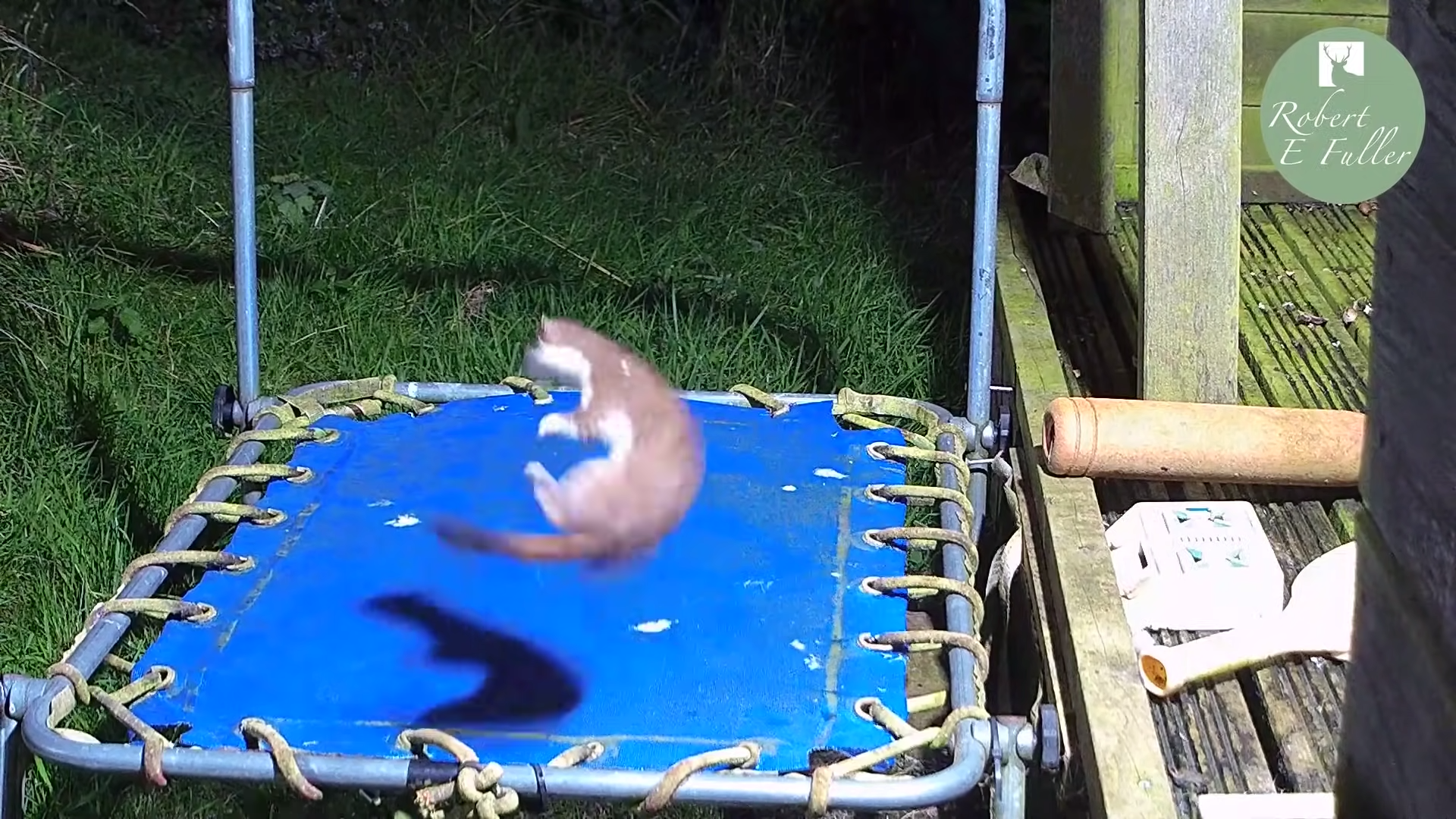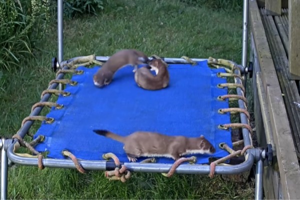 2021年03月15日野生動物也喜歡玩遊戲!英國北約克郡的野生動物藝術家Robert Fuller,為小孩在院子裡加裝了彈跳床,白天孩子經常去嬉戲。5年前的一天,Robert發現彈跳床上出現了一些神秘的小腳印。他假裝監視器後才發現,住在附近的野生白鼬經常趁半夜跑來玩。
