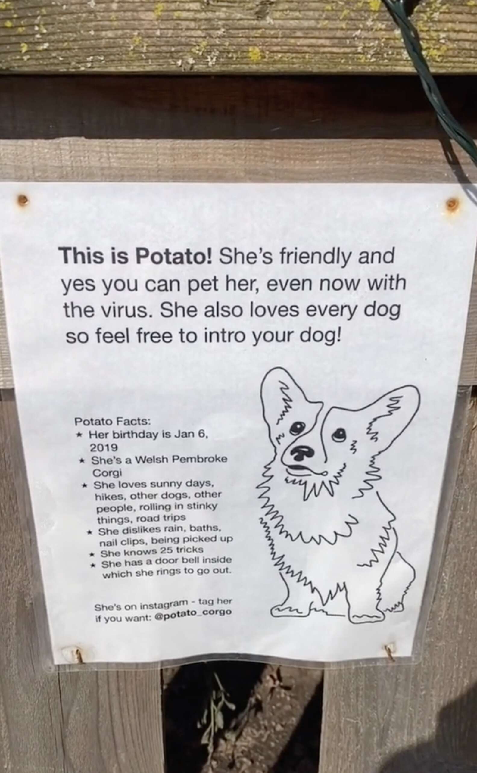 2021年03月22日這隻狗狗太愛撒嬌啦~Potato是一隻很喜歡交朋友的柯基犬,牠每天最喜歡做的事就是跟鄰居們玩耍。Potato的主人Cee開玩笑說:「牠的就像商店門口的迎賓員一樣,超級熱情。」從6個月大開始,Potato就整天待在院子裡,看到有人路過就跑到門口求摸,牠是社區裡很有名的「交際花」。