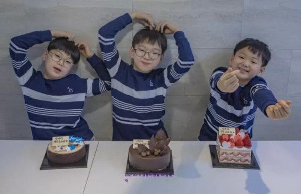 ▼現在大韓、民國、萬歲已經9歲了,南韓論壇「DC Inside」上,有網友曝光了他們的慶生照。從照片中可以看到,三胞胎穿著同樣的上衣,每人面前都擺著一個蛋糕,正對著鏡頭擺出可愛的表情。