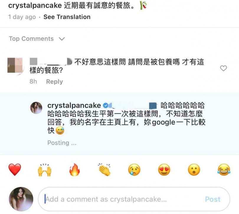 ▼面對網友的「被包養」質疑,穆熙妍回:「我生平第一次被這樣問,不知道怎麼回答,我的名字在主頁上有,妳Google一下比較快。」她還幽默表示,這輩子被問到不知如何回答的問題實在不多,這算一個。