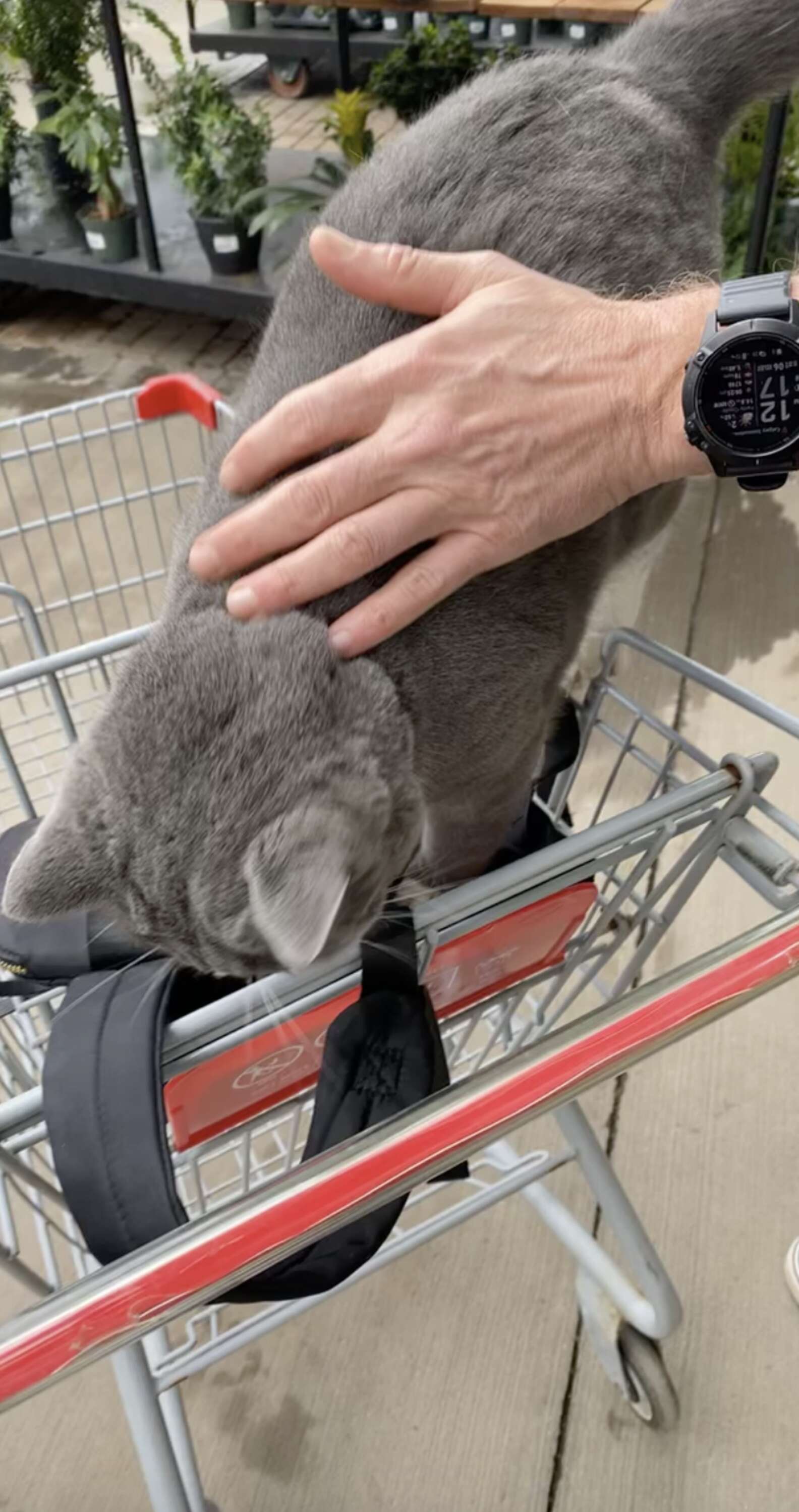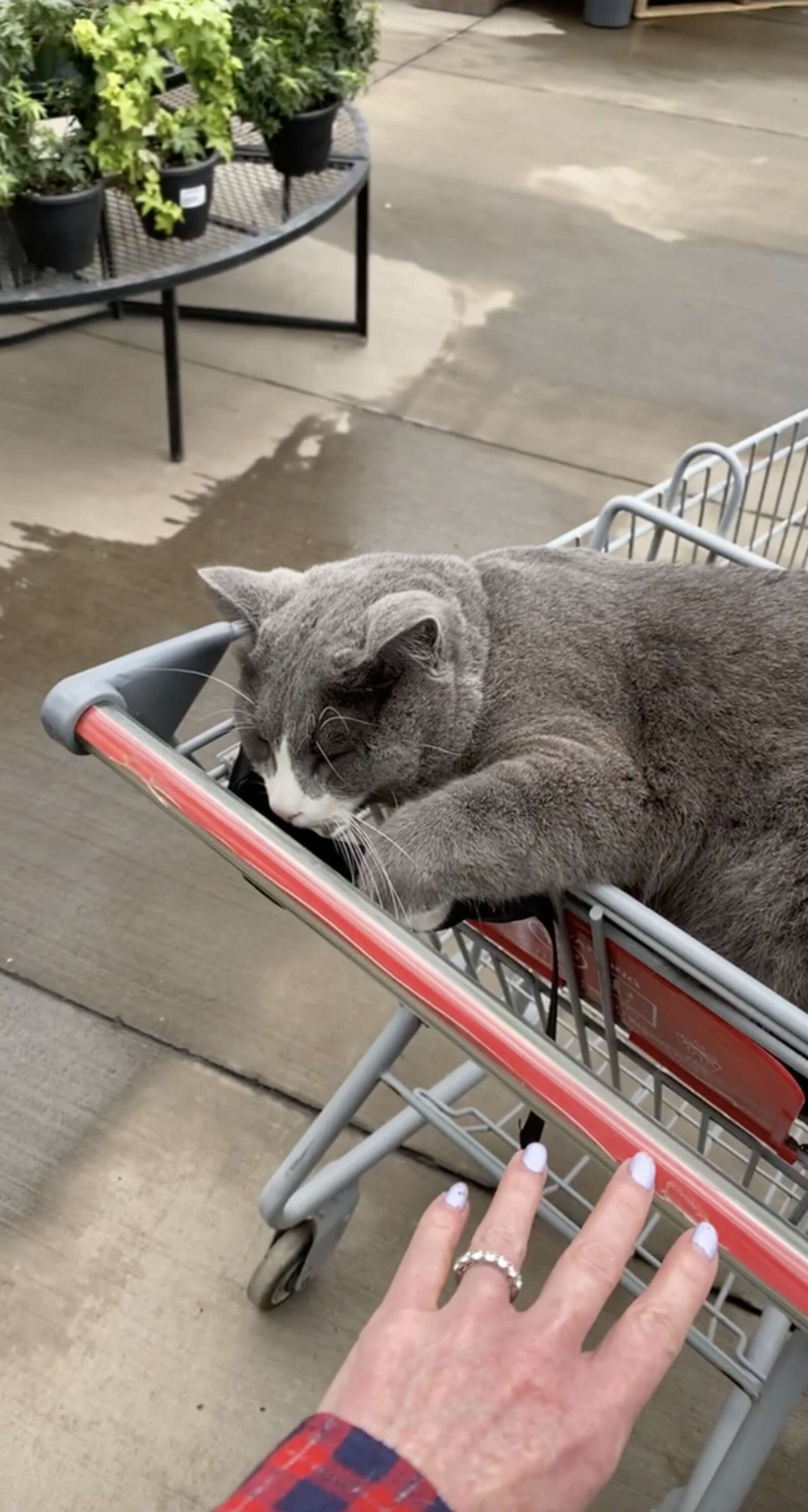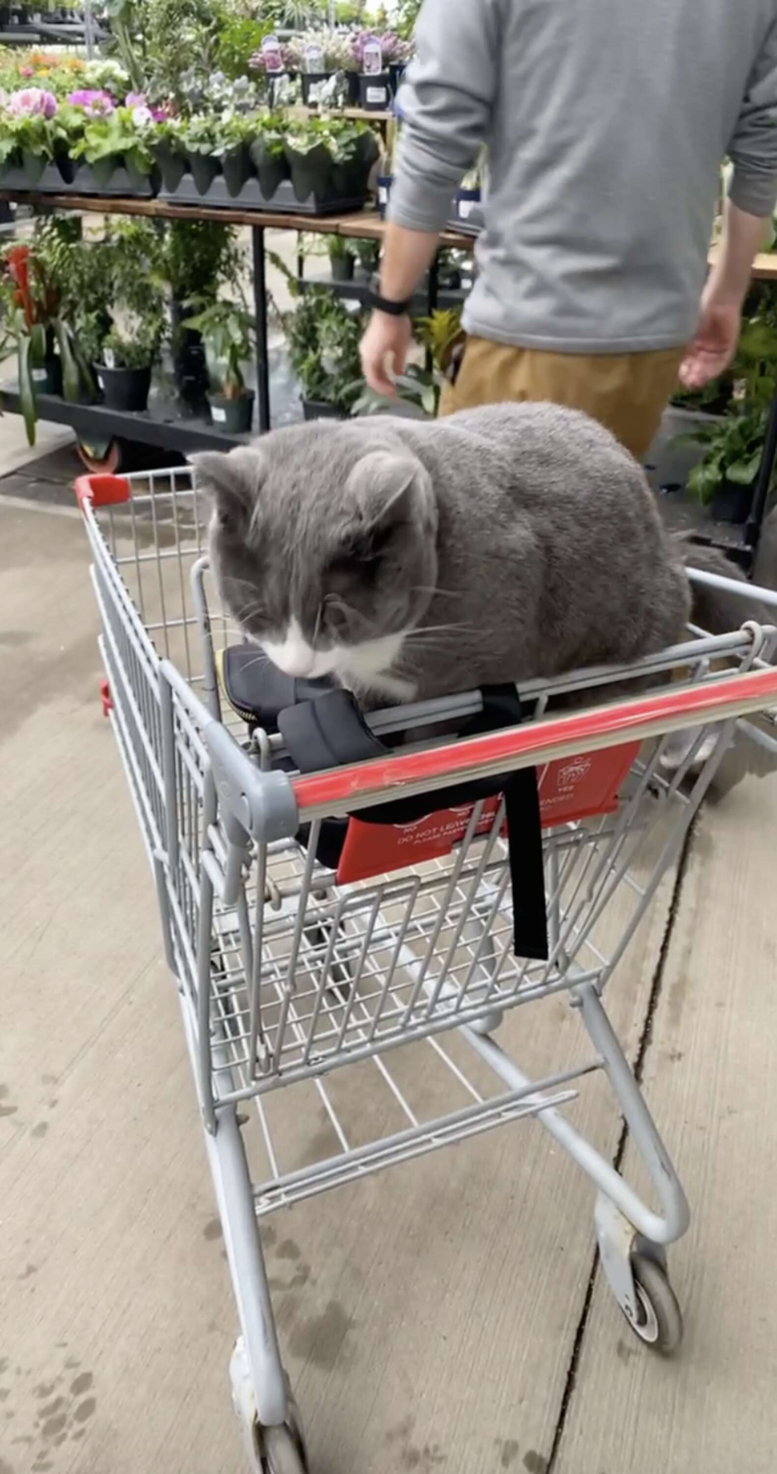 ▼Boots在Gray的購物車裡待了15分鐘左右,然後就離開了。Gray表示,Boots是一隻很典型的店貓,牠希望獲得所有顧客的關注。牠跳進購物車、待在購物車裡的樣子很自然,顯然經常這樣做。