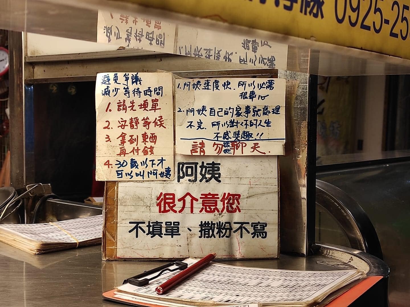 ▼旁邊的另一張公告上,還強調「請勿聊天」,原因是:「阿姨速度快,所以必須很專心;阿姨自己的家事就處理不完,所以對你的人生不感興趣!」下方則寫著「阿姨很介意您不填單、撒粉不寫」。原po說,他看到這霸氣的宣言超心驚 ,等待的過程中一句廢話都不敢講。