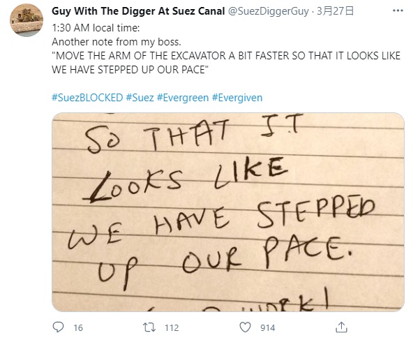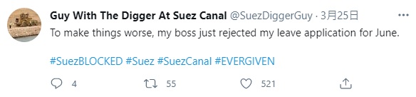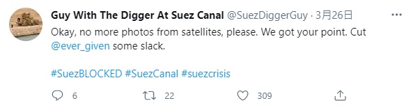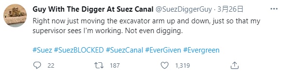 ▼「Guy With The Digger At Suez Canal」這個推特帳號是今年3月創立的,第一篇發文是在3月25日,也就是蘇伊士運河堵塞2天後。現在還不確定這是否真的是小挖土機司機本人的帳號,但po文內容風趣幽默,又非常真實,完美表達出了司機的心聲。再來看一下這些有趣的po文吧: