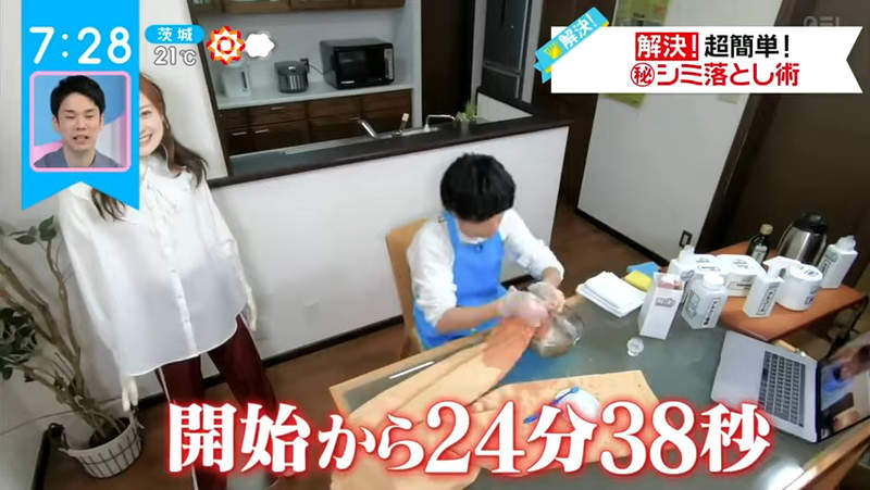 ▼不用專家出手,神宮寺勇太就輕輕鬆鬆解決飲料污漬。他先在污垢下方墊上毛巾;