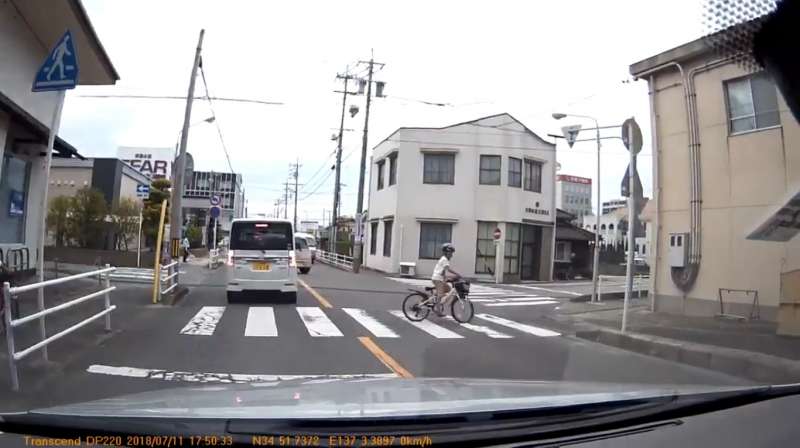這種視覺上的容易忽略的地方真的很可怕,對向車輛完全不會看到在休旅車的後方會突然冒出騎著腳踏車的小孩,如果不小心煞車不及就會釀成交通事故了!而從這一個細微的動作中,可以看到日本人連開車時都會貼心的替別人著想,日本的公民教育實在太成功了!