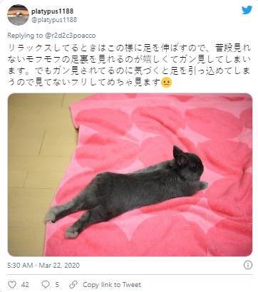 ▼「我家兔兔放鬆的時候,就會像這樣躺下來把腳伸直,這時候就可以看到平時看不見的毛茸茸腳底,有時我會過於著迷盯著看。 但如果一直盯著看被兔兔發現的話,它會把腳縮起來,所以你盯著看的時候還要假裝沒在看。 」