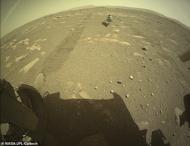 ▼從照片中可以看到,機智號落地後,毅力號駛離飛行場。之前機智號依靠毅力號的動力系統,但現在開始要使用自己的電池來運行加熱器。火星的夜晚非常寒冷,加熱器能防止各個零件凍結、裂開。