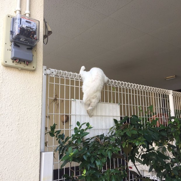 ▼這隻貓咪掛在欄杆上,好像是逃家逃到一半,然後遇到困難卡住了。牠身手矯健、動作敏捷,一定不是第一次犯案了。不知道這一次牠遇到了什麼事,竟然逃脫失敗,卡在了欄杆上。牠的身體還有起伏,可以證明牠尚有呼吸,顯然沒有生命危險。