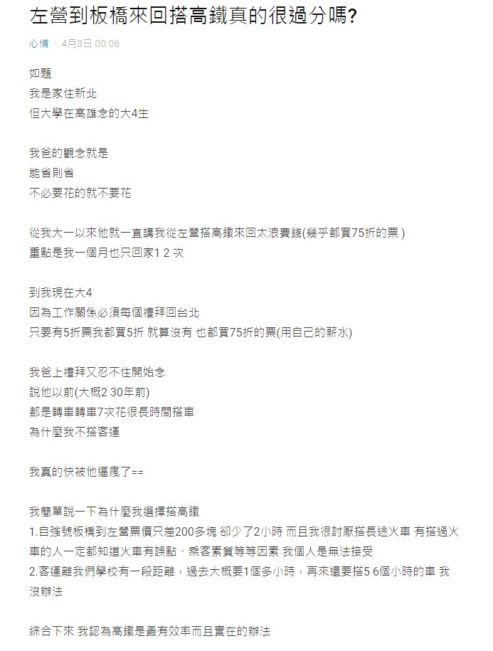 原po表示,她從大一開始就搭高鐵南北跑,通常一個月會回家1、2次,幾乎都會買75折的車票。不過爸爸的觀念是「能省則省,不必要花的就不要花」,認為她搭高鐵太浪費錢。不過原po認為,她現在已經大四了,因為工作的關係必須每個禮拜回台北,她都是用自己的薪水買5折或75折高鐵票的。