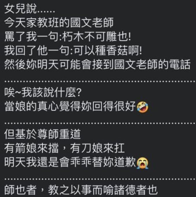 ▼原po表示,之前女兒回家說自己被國文老師訓斥的整個過程,原po聽完後覺得又好氣又好笑,她認為女兒的回覆非常好。不過基於尊師重道,媽媽還是替女兒向老師道歉,並說:「有箭娘來擋,有刀娘來扛。」