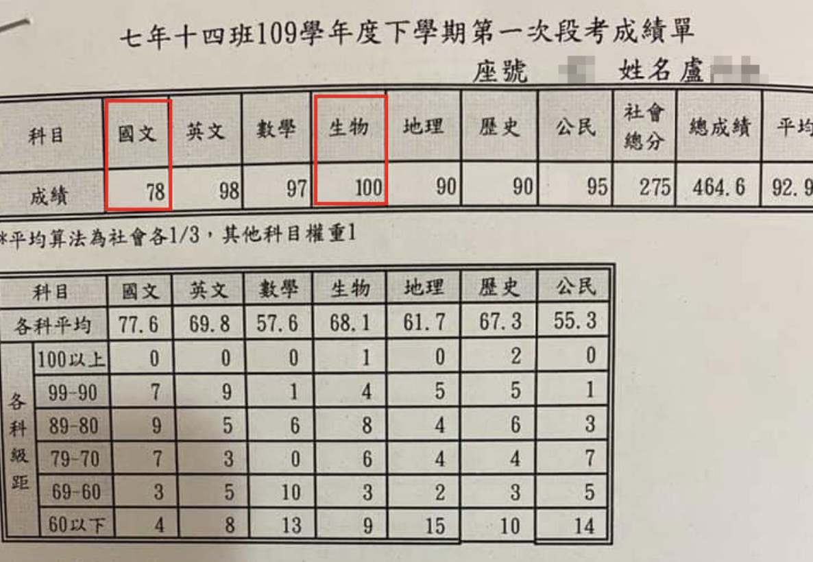 ▼從原po貼出的成績單可以看到,女兒的生物考了全班唯一的滿分,其他科目的成績也很好,分別是英文98分、數學97分、公民95分、地理90分、歷史90分、國文78分。她說女兒「在種香菇的道路上持續努力」,感嘆:「真不知道她是故意的還是巧合,結論就是:她說國文老師報她分數的時候臉很78!」
