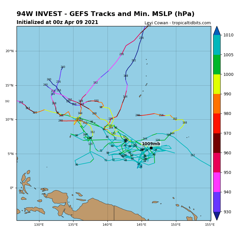 ▼美國佛州大學氣象博士Levi Cowan在個人網站中統整出美國系集模式路徑模擬圖(GEFS Ensembles),並研判出菲律賓東方海面低壓系統路徑預測圖。預測圖顯示,未來10天它的強度會持續增強,並有朝北移動的趨勢,不過後續態勢還需要更多觀察。