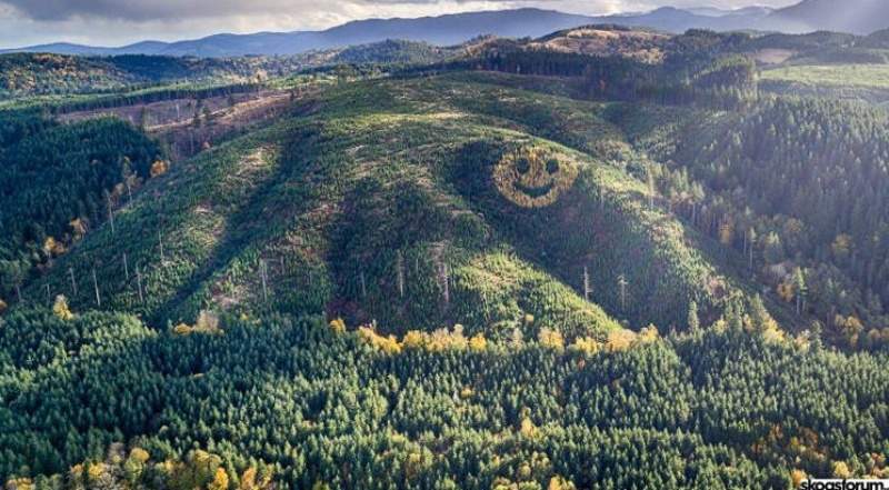 ▼這個笑臉是怎麼來的呢?原來這是漢普頓木材公司在2011年建的。他們用不同的植物組成了這個圖案。其中黃色的是落葉松,綠色的則是道格拉斯冷衫。隨著季節的變化,植物的顏色會改變,這個直徑有300英尺(約91.44公尺)的笑臉,就成為了這條路上最特別的風景。