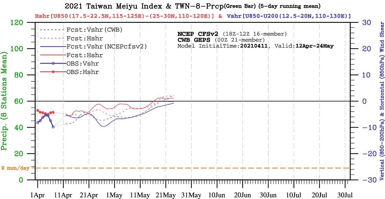 鄭明典表示,梅雨指標圖上的紅色線是低層水平環流指數,代表台灣附近屬於正渦度區,一般來說是有鋒面在附近的意思。藍色線則是垂直風切指數,正值代表西南季風條件出現。紅色線和藍色線同時為正值,則代表台灣有很大機率出現連續的顯著降雨,也就是平時我們所說的「梅雨」。