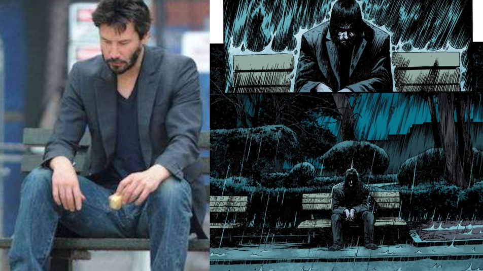 ▼漫畫的主角有一頭瀟灑的長髮,還有充滿特色的尖下巴,簡直跟基努李維一模一樣。尤其是漫畫中有一幕,男主角獨自坐在大雨中的路邊長椅上,讓人聯想到基努李維的那張知名街拍照。